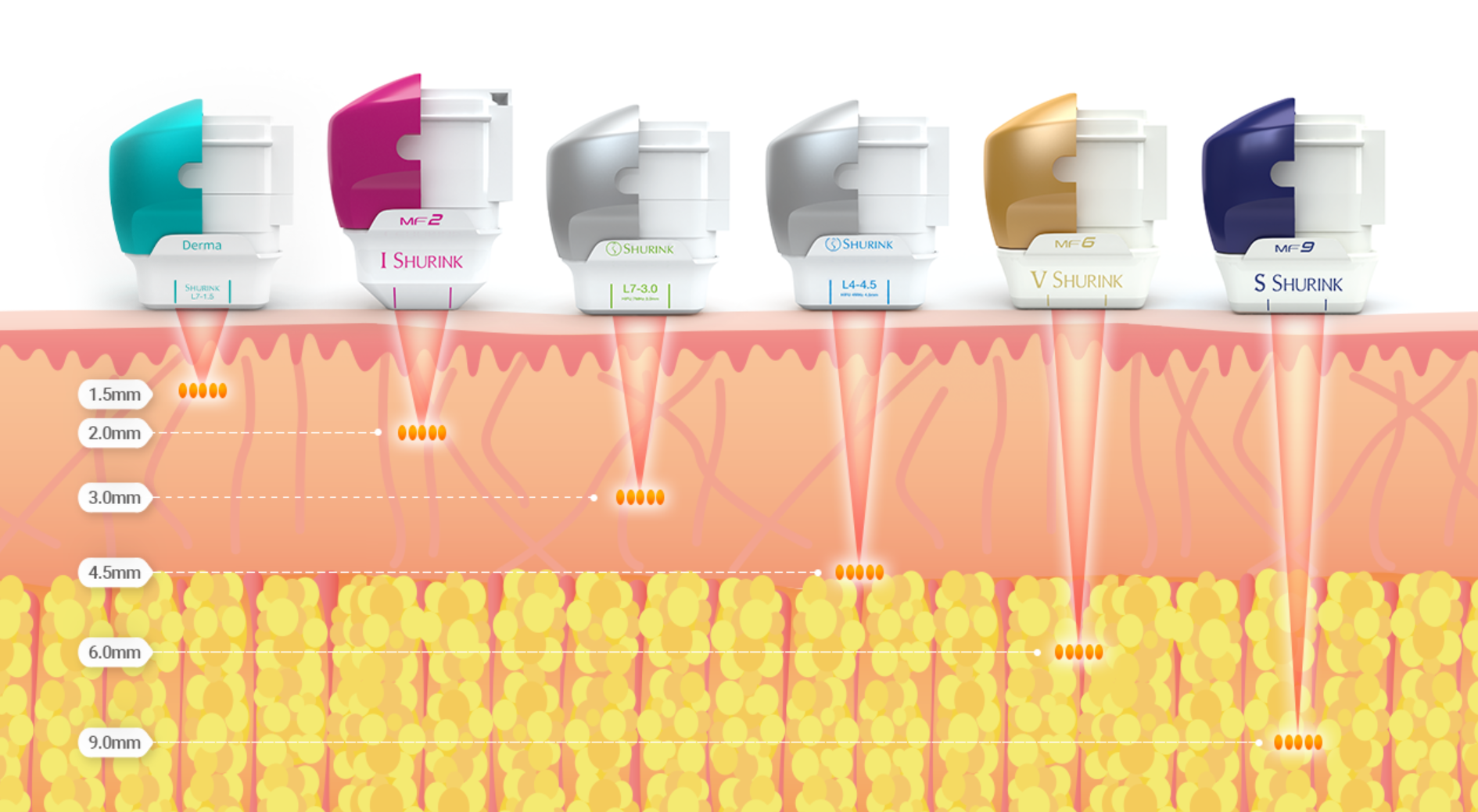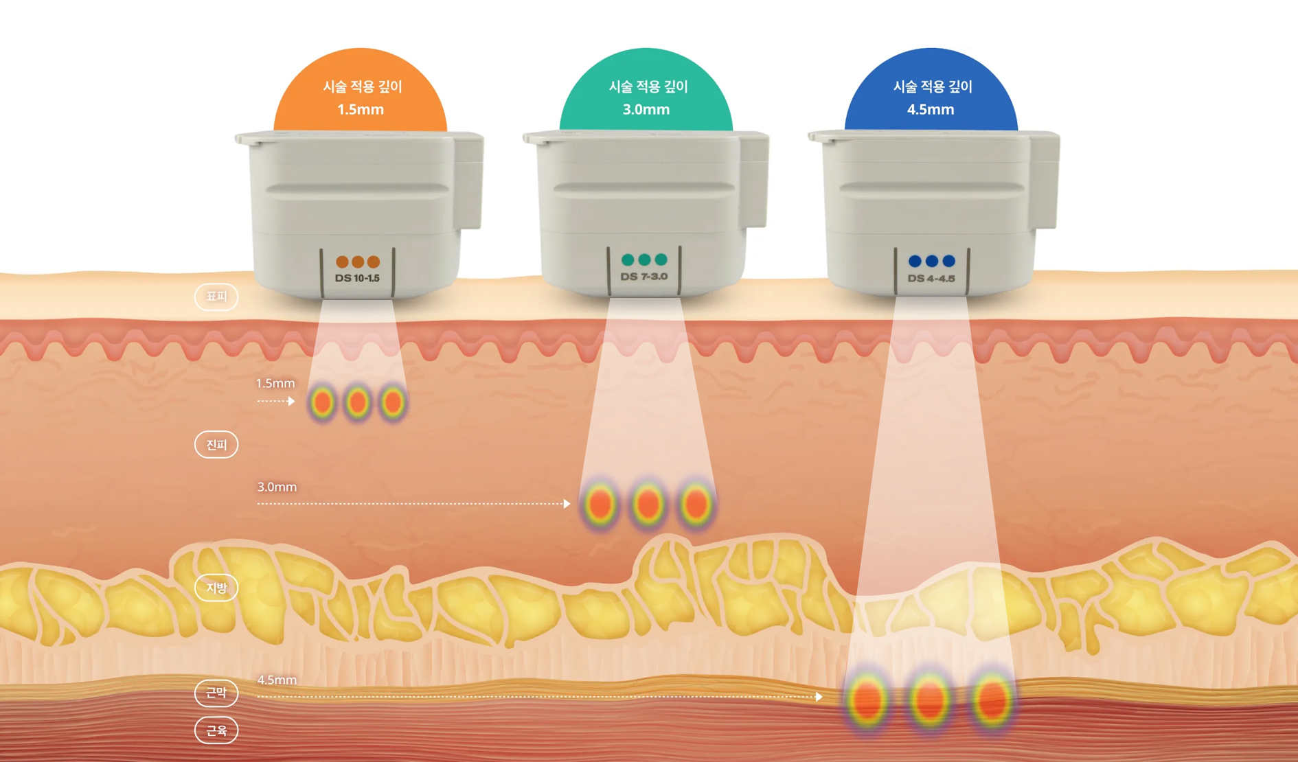 울쎄라는 4.5mm·3.0mm·1.5mm 등 서로 다른 깊이의 카트리지를 사용해 진피층과 SMAS층에 초음파 에너지를