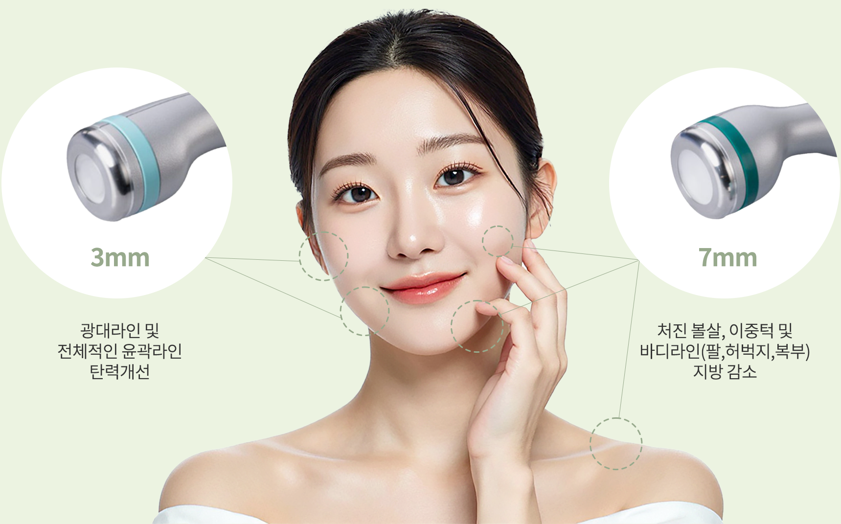 2개의 핸드피스(3mm와 7mm)로 피부 진피층의 지방에 침투 깊이를 조절하여 새롭고 젊은 콜라겐 섬유로 리모델링 합니다.